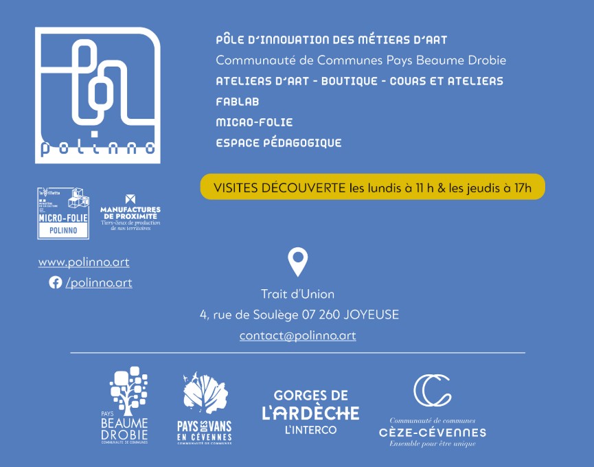 La Communauté de communes du Pays Beaume-Drobie mène, depuis bientôt 20 ans, une politique active en faveur du développement de la filière des métiers d’art. En 2006, elle a créé, en coopération avec l’association Amesud et le Syndicat mixte du Pays de l’Ardèche méridionale, une pépinière d’entreprises spécialisée dans les métiers d’art, Pépit’art, l’une des premières à l’échelle nationale. Des années plus tard, le projet a évolué pour répondre aux besoins des artisans d’art et du territoire : le Polinno, pour Pôle d’innovation des métiers d’art, était né.